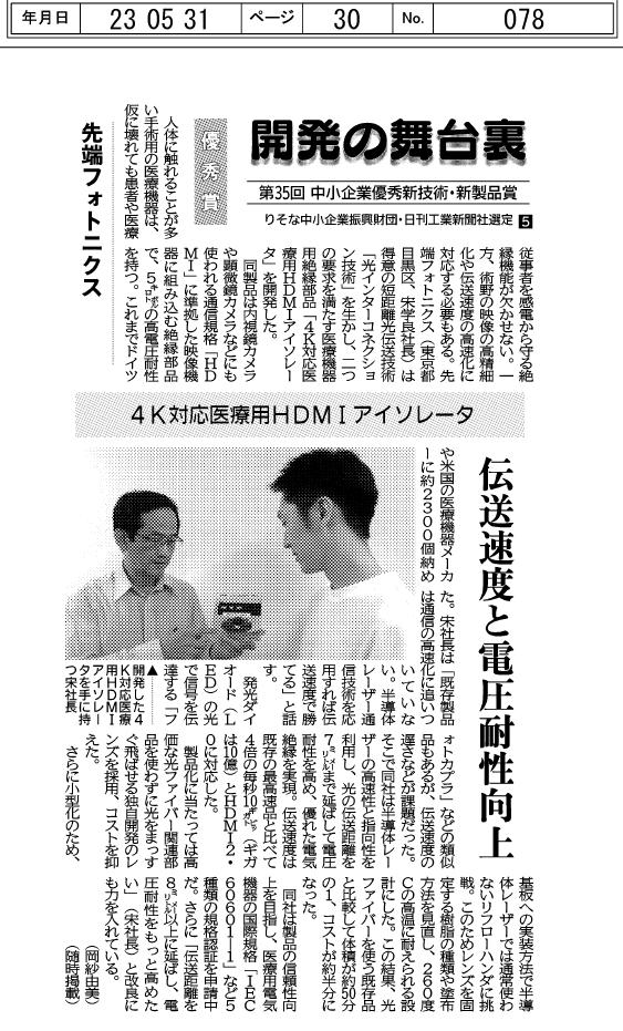 We were featured in The Nikkan Kogyo Shimbun's "Behind the Scenes of Development" special series as a recipient of the Excellent New Technology and Product Awards for Small and Medium Enterprises.